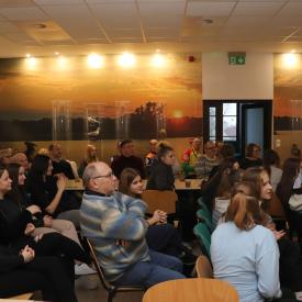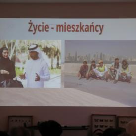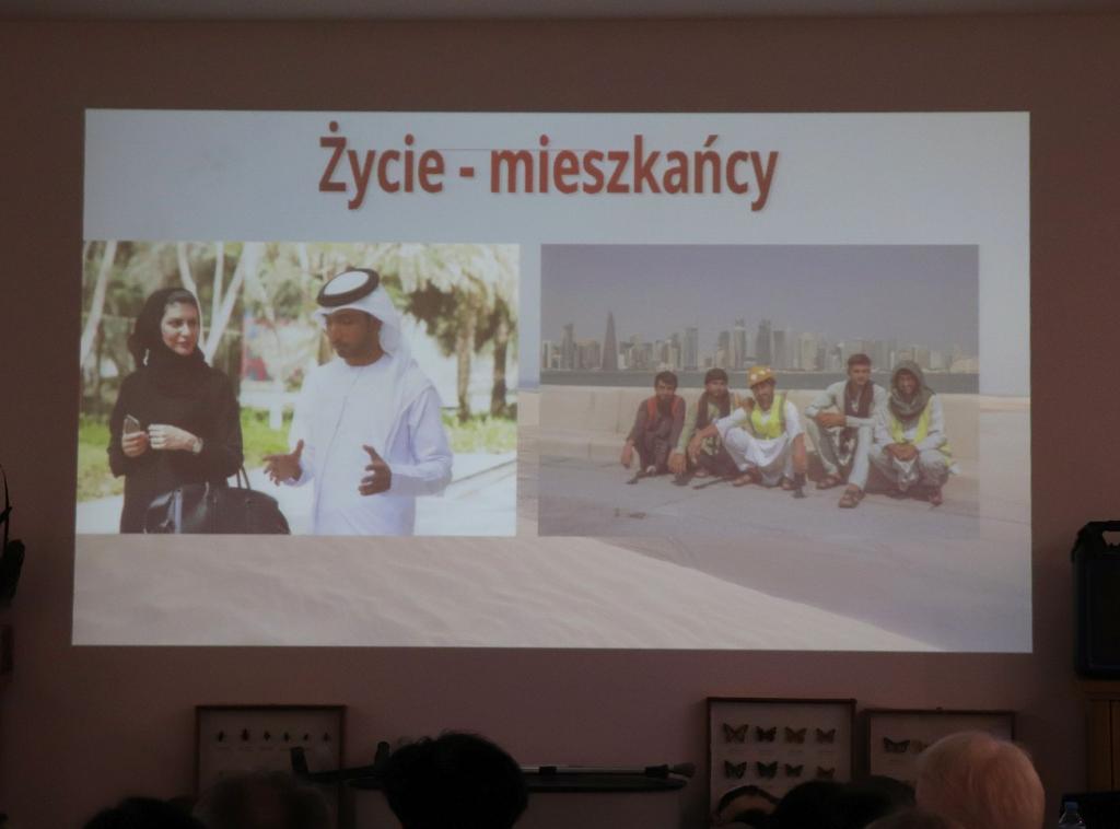Pan Marcin podzielił swoją prelekcję na kilka części: codzienne życie, kultura, atrakcje turystyczne, jedzenie i ciekawostki. Cechą najbardziej wyróżniającą Katar jako państwo jest to, że na bardzo małej powierzchni mieszka ok. 300 tys. rodowitych Katarczyków i kilka milionów obcokrajowców, którzy pracują w zawodach mniej prestiżowych i za dużo mniejsze pieniądze.