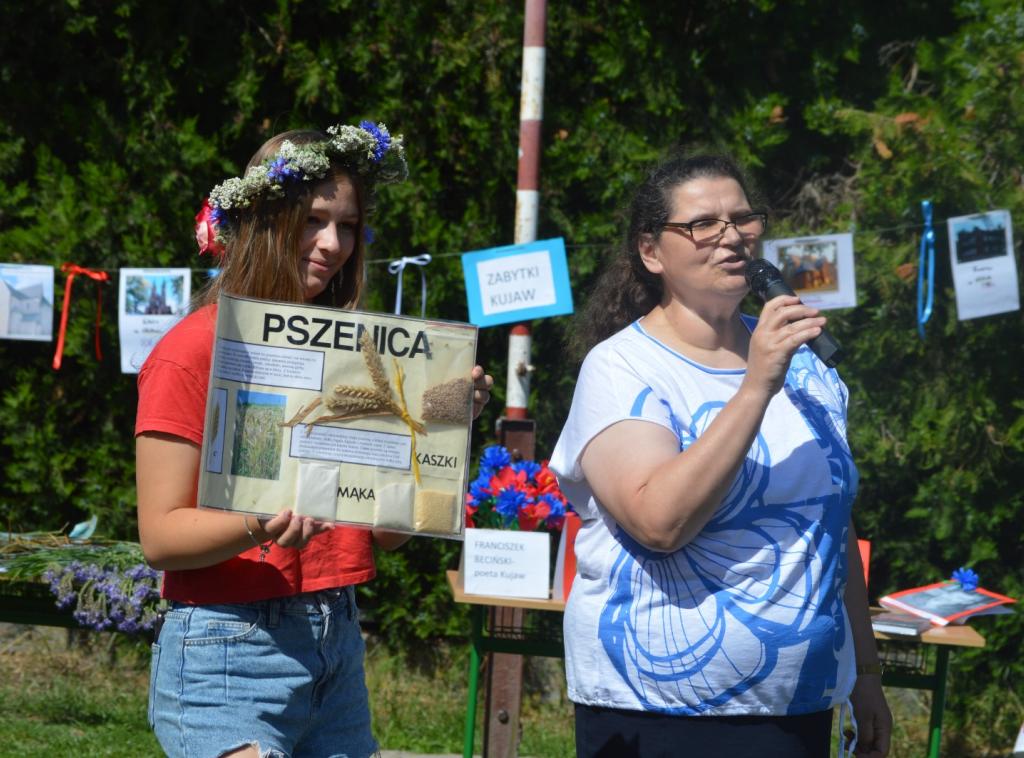 W trakcie imprezy odbyła się prezentacja sylwetki i wierszy Franciszka Becińskiego, prezentacja stroju i haftu, nauka sypania wzorów z piasku. Oczywiście nie zabrakło tańców i śpiewów. Młodsi uczniowie oraz przedszkolacy z właściwą sobie gracją, w przepięknych ludowych strojach wykonywali kujawiaka, a ten kujawiak prawie na sto par…, ach, był cudowny! „Czerwone jabłuszko” wybrzmiało głośno z młodszych i starszych gardeł. Wszyscy nieco zmęczeni chętnie degustowali regionalne przysmaki – chleb ze smalcem oraz kiszonym ogórkiem znikały ze stołu, a kompot z rabarbaru zdaniem Adasia z klasy VIII był… odlotowy! Ciasteczka i drożdżowe placki… - no cóż, szybko przeszły do historii… Po odzyskaniu sił można było włączyć się w zabawy młodych Kujawian z dawnych lat. Trzeba było się śpieszyć, aby jeszcze obejrzeć wystawy w szkole: malowanych talerzy, plakatów z gwarą kujawską, makatek z papieru, papierowych firanek, przepisów kulinarnych. Bukiety chabrów i maków z bibuły jeszcze długo będą przypominały ten niezwykły dzień. W przygotowanie tej niezwykłej uroczystości włączyła się cała społeczność szkoły, a owa integracja zaowocowała poszerzeniem wiedzy o regionie.